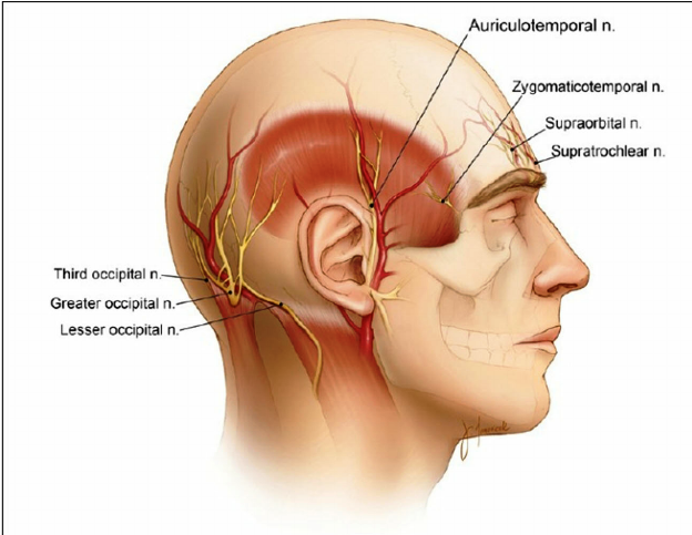 Sensory Nerve Supply (Posterior to Auricle) Greater occipital nerve (Posterior ramus of C2): Supplies the occipital region up to the vertex. Lesser occipital nerve (Cervical plexus, C2/C3): Supplies the scalp behind the ear. Third occipital nerve (Posterior ramus of C3): Supplies the lower occipital region. Great auricular nerve (C2/C3): Supplies the scalp posterior to the ear.