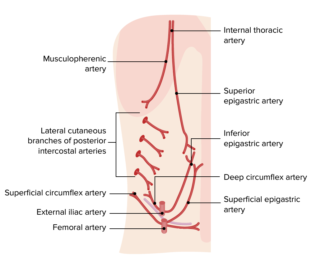 Anterior cutaneous branches of superior and inferior epigastric arteries Lateral cutaneous branches of posterior intercostal arteries Three superficial branches of femoral artery Superficial external pudendal artery Superficial epigastric artery Superficial circumflex iliac artery Deep circumflex iliac artery (branch of external iliac artery)