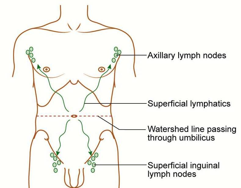 axillary and superficial inguinal nodes and follow water-shed line at level of umbilicus as follows -- 1. Above umbilicus, lymphatic vessels run upward to drain into the axillary lymph nodes 2. Below umbilicus, lymphatic vessels run downward to drain into superficial inguinal nodes