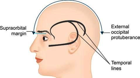 Extends -- Anteriorly: Up to supraorbital margins,,, Posteriorly: Up to external occipital protuberance and superior nuchal line,,, On each side: Up to zygomatic arch and external acoustic meatus