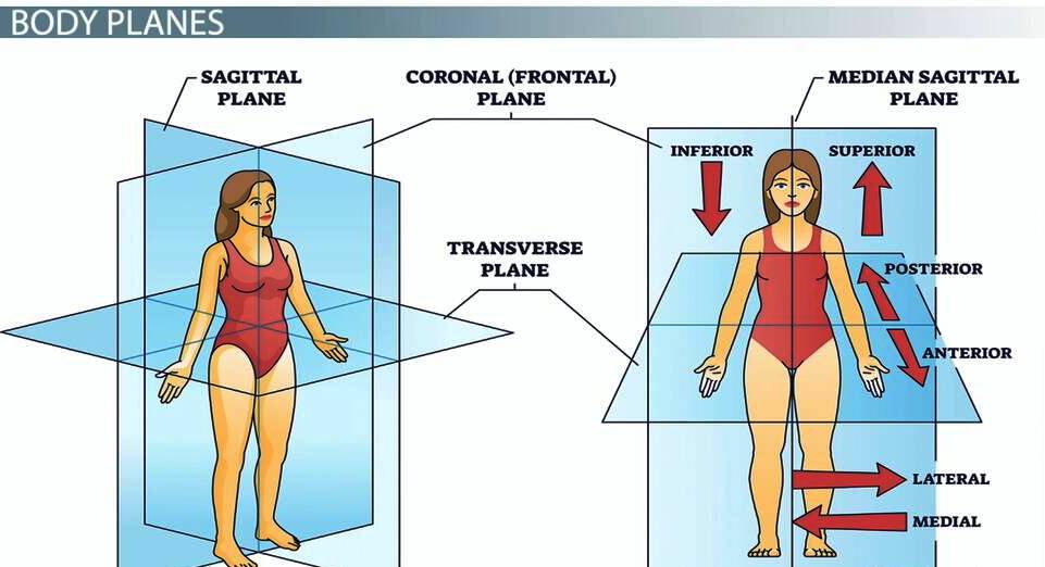 The sagittal plane (dividing into right and left halves), the coronal (or frontal) plane (dividing into front and back portions), and the transverse (or horizontal/axial) plane (dividing into upper and lower halves).-PKK