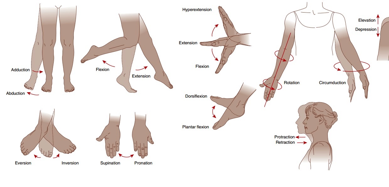 flexion - extension abduction - adduction circumduction (no opposite) elevation - depression internal/medial rotation - external/lateral rotation dorsiflexion - plantar flexion pronation - supination inversion - eversion protrusion/protraction - retrusion/retraction opposition - reposition