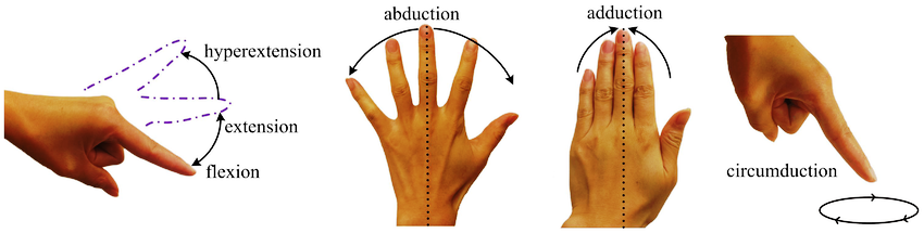 flexion (curling the finger towards the palm), extension (straightening the finger away from the palm), abduction (spreading fingers apart), and adduction (moving fingers together)-PKK