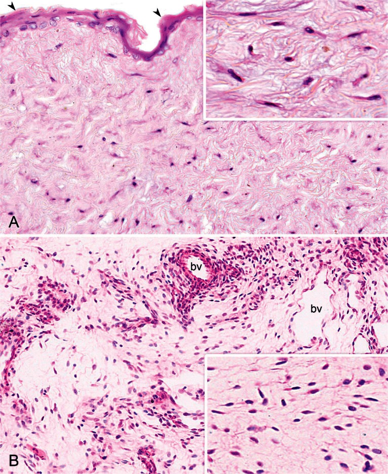 Areolar tissue - Characterized by a semi-fluid matrix with sparse collagen and elastic fibers, and is found beneath epithelia, surrounding blood vessels, and between muscles-PKK