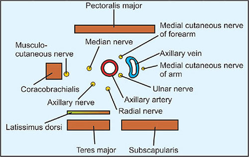 Third part (distal to pectoralis minor) Anterior: Skin, superficial fascia, and deep fascia. Posterior: Radial nerve, axillary nerve (in the upper part), and the subscapularis, latissimus dorsi, and teres major muscles (tendons). Lateral: Coracobrachialis muscle, musculocutaneous nerve, and the lateral root of the median nerve (in the upper part). Medial: Axillary vein and the medial cutaneous nerve of the arm and forearm.