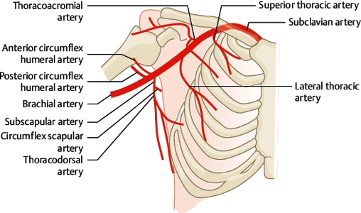 First part Superior thoracic artery: Supplies blood to the pectoralis minor and major muscles. Second part Thoracoacromial artery: Divides into several branches, including the acromial, pectoral, clavicular, and deltoid arteries. Lateral thoracic artery: Supplies the pectoral muscles, serratus anterior, and the mammary gland.