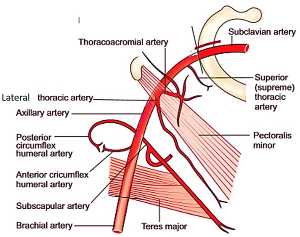 Third part Subscapular artery: The largest branch, which gives off the circumflex scapular and thoracodorsal arteries. Anterior circumflex humeral artery: Wraps around the surgical neck of the humerus. Posterior circumflex humeral artery: Also wraps around the surgical neck of the humerus, supplying blood to the shoulder joint and surrounding muscles.