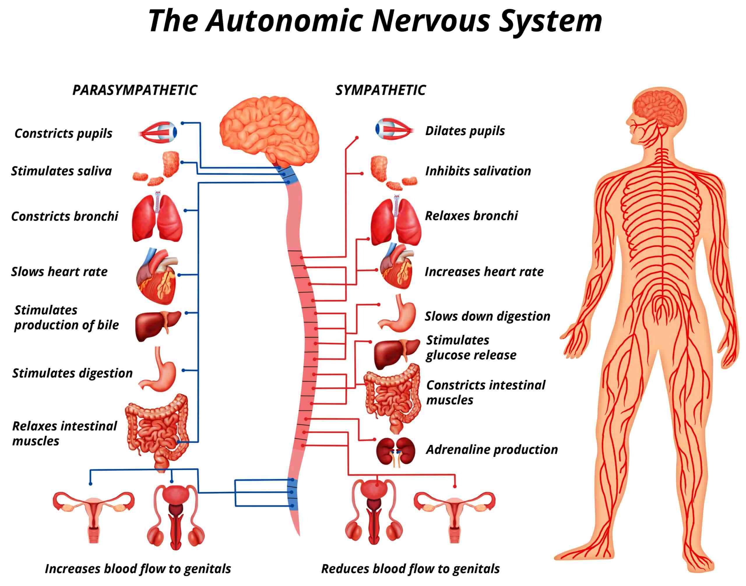 Heart Rate & Blood Pressure: Regulates how fast your heart beats and your blood pressure. Respiration: Adjusts your breathing rate. Digestion: Manages digestion, nutrient absorption, and waste elimination. Metabolism: Controls metabolic processes and energy use. Temperature Regulation: Manages sweating and blood flow to cool or warm the body. Pupil Response: Controls pupil dilation and constriction. Sexual Arousal: Involved in sexual function